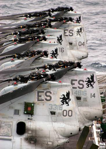 | Keywords: US Navy 040222-N-8053S-005 CH-46 Sea Knights standby on the flight deck.jpg en Atlantic Ocean Feb 22 2004 CH-46 Sea Knights assigned to Marine Medium Helicopter Squadron Two Six Six HMM-266 standby on the flight deck aboard the amphibious assault ship USS Wasp LHD 1 HMM-266 is the Aviation Combat Element ACE of the 22nd Marine Expeditionary Unit 22 MEU aboard Wasp while on deployment in support of the global war on terrorism Wasp and HMM-266 are elements of Expeditionary Strike Group ESG 2 U S Navy photo by Photographer s Mate 3rd Class David K Simmons RELEASED 2004-02-22 040222-N-8053S-005 Navy http //www navy mil/view_image asp id 12092 U S Navy photo by Photographer s Mate 3rd Class David K Simmons PD-USGov-Military-Navy CH-46 Sea Knight USS Wasp LHD-1 flight deck |