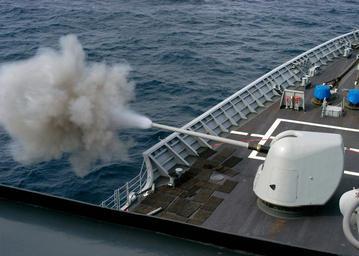 | Keywords: US Navy 040225-N-8053S-191 A 54 caliber (MK 45) 5-inch lightweight gun is fired aboard the guided missile cruiser USS Leyte Gulf (CG 55) as part of a live fire exercise.jpg en Atlantic Ocean Feb 25 2004 A 54 caliber MK 45 5-inch lightweight gun is fired aboard the guided missile cruiser USS Leyte Gulf CG 55 as part of a live fire exercise Leyte Gulf is currently on deployment with Expeditionary Strike Group Two ESG 2 which also consists of the guided missile cruiser USS Yorktown CG 48 amphibious transport ship USS Shreveport LPD 12 guided missile destroyer USS McFaul DDG 74 fast attack submarine USS Connecticut SSN 22 amphibious assault ship USS Wasp LHD 1 and the 22nd Marine Expeditionary Unit 22nd MEU U S Navy photo by Photographer s Mate 3rd Class David K Simmons RELEASED 2004-02-25 040225-N-8053S-191 Navy http //www navy mil/view_image asp id 12854 U S Navy photo by Photographer s Mate 3rd Class David K Simmons PD-USGov-Military-Navy 5 /54 caliber Mark 45 gun firing USS Leyte Gulf CG-55 |