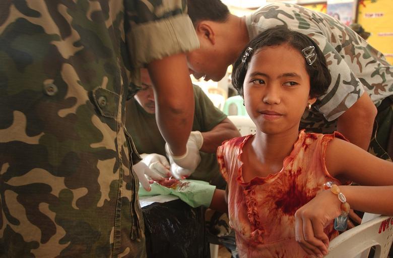 | Keywords: US Navy 040226-N-4142G-023 A young child receives medical aid from military personnel participating in the Medical Civic Action Program (MEDCAP) in Bargangay San Miguel as a part Exercise Balikatan 2004.jpg  en Puerto Princesa Palawan Republic of the Philippines RP Feb 26 2004 A young child receives medical aid from military personnel participating in the Medical Civic Action Program MEDCAP in Bargangay San Miguel as a part Exercise Balikatan 2004 The MEDCAPs are staffed by the medical doctors dentists nurses and veterinarians from both the RP and U S Armed Forces and provide much needed medical and dental services to the residents of eight Barangays; Mandaragat San Miguel Model Milagrosa Sta Lourdes Irawan Luzviminda and Tiniguiban Minor surgeries tooth extraction and medicines of various sorts are also distributed among the Barangay beneficiaries This exercise is only one of a number of on-going activities under the framework of RP-US military security cooperation Other elements include assistance with comprehensive defense reform security assistance modules for counter terrorism training helicopter night capability training intelligence fusion; subject matter expert exchanges; international military education and training programs advice and support for logistics engineering equipment maintenance and civil military operations U S Navy photo by Photographer s Mate 2nd Class Felix Garza Jr RELEASED 2004-02-26 040226-N-4142G-023 Navy http //www navy mil/view_image asp id 12204 U S Navy photo by Photographer s Mate 2nd Class Felix Garza Jr PD-USGov-Military-Navy Images from US Navy location Puerto Princesa Philippines Balikatan 2004 Healthcare in the Philippines Photographs by Felix Garza Jr |