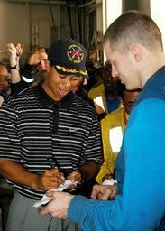 Keywords: US Navy 040303-N-7340V-032 Professional Golfer Tiger Woods signs autographs for the crew after a golf ball driving demonstration aboard the nuclear powered aircraft carrier USS George Washington (CVN 73).jpg en Arabian Gulf March 3 2004 Professional Golfer Tiger Woods signs autographs for the crew after a golf ball driving demonstration aboard the nuclear powered aircraft carrier USS George Washington CVN 73 Tiger Woods accompanied by his fiancé Elin Nordegren PGA player Mark O Meara and caddies Steve Williams and Greg Rita visited the Norfolk Va Based carrier in the Arabian Gulf before participating in the European PGA Tour s Dubai Desert Classic on Thursday The George Washington Carrier Strike Group CSG and Carrier Air Wing Seven CVW-7 are deployed to the Arabian Gulf in support of Operations Iraqi and Enduring Freedom U S Navy photo by Photographer's Mate 1st Class James Vidrine RELEASED 2004-03-03 040303-N-7340V-032 Navy http //www navy mil/view_image asp id 12371 U S Navy photo by Photographer's Mate 1st Class James Vidrine PD-USGov-Military-Navy Aboard USS George Washington CVN-73 Sportspeople giving autographs Tiger Woods in 2004 |