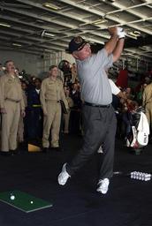 | Keywords: US Navy 040303-N-5319A-007 Sailors watch professional golfer Mark O'Mara hit a few golf balls during a demonstration in the hanger bay of the nuclear powered aircraft carrier USS George Washington (CVN 73).jpg en Arabian Gulf Mar 3 2004 Sailors watch professional golfer Mark O'Mara hit a few golf balls during a demonstration in the hanger bay of the nuclear powered aircraft carrier USS George Washington CVN 73 Tiger Woods accompanied by his fiancé Elin Nordegren PGA player Mark O Meara and caddies Steve Williams and Greg Rita visited the Norfolk Va Based carrier in the Arabian Gulf before participating in the European PGA Tour s Dubai Desert Classic on Thursday The George Washington Carrier Strike Group CSG and Carrier Air Wing Seven CVW-7 are deployed to the Arabian Gulf in support of Operations Iraqi and Enduring Freedom U S Navy photo by Photographer's Mate 1st Class Brien Aho RELEASED 2004-03-03 040303-N-5319A-007 Navy http //www navy mil/view_image asp id 12365 U S Navy photo by Photographer's Mate 1st Class Brien Aho PD-USGov-Military-Navy Aboard USS George Washington CVN-73 Mark O'Meara |