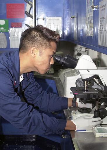 Keywords: US Navy 040421-N-7949W-001 Hospital Corpsman 2nd Class Patrick C. Mangaran from Beach Park, Ill, examines a blood sample.jpg en At sea aboard the amphibious assault ship USS Tarawa LHA 1 Apr 21 2004 - Hospital Corpsman 2nd Class Patrick C Mangaran from Beach Park Ill examines a blood sample aboard the amphibious assault ship USS Tarawa LHA 1 Petty Officer Patrick is Tarawa's only medical laboratory technician and is responsible for all blood and culture tests preformed aboard the ship Tarawa recently conducted a Command Assessment for Readiness and Training phase II CART II evolution off the coast of Southern California U S Navy photo by Photographer's Mate 1st Class Daniel Woods RELEASED 2004-04-21 040421-N-7949W-001 Navy http //www navy mil/view_image asp id 13717 U S Navy photo by Photographer's Mate 1st Class Daniel Woods PD-USGov-Military-Navy Aboard USS Tarawa LHA-1 Hospital Corpsman |