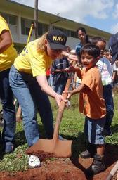 | Keywords: US Navy 040422-N-3019M-003 Master-at-Arms 3rd Class Angela Jeffery, assigned to Pearl Harbor Security Detachment, helps a child from Webling Elementary School dig a hole for a Ku Kui tree in honor of Earth Day.jpg  en Pearl Harbor Hawaii Apr 22 2004 - Master-at-Arms 3rd Class Angela Jeffery assigned to Pearl Harbor Security Detachment helps a child from Webling Elementary School dig a hole for a Ku Kui tree in honor of Earth Day Ten Sailors planted three trees and helped weed a Taro patch at the school to help raise awareness of the environment Naval Station Pearl Harbor had more than 450 Sailors volunteer for various clean-up and planting activities around the Naval Station and the Oahu Island U S Navy photo by Journalist Seaman Ryan C McGinley RELEASED 2004-04-22 040422-N-3019M-003 Navy http //www navy mil/view_image asp id 13559 U S Navy photo by Journalist Seaman Ryan C McGinley PD-USGov-Military-Navy People at Pearl Harbor 2004 in Pearl Harbor Images from US Navy location Pearl Harbor Hawaii Master-at-arms |
