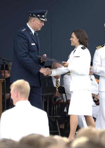 Keywords: US Navy 040528-N-9693M-015 Newly commissioned Ensign Colleen Maloney, from Canton, Ohio, receives her diploma from the Chairman of the Joint Chiefs of Staff Gen. Richard B. Meyers at the U.S. Naval Academy.jpg en U S Naval Academy May 28 2004 Newly commissioned Ensign Colleen Maloney from Canton Ohio receives her diploma from the Chairman of the Joint Chiefs of Staff Gen Richard B Meyers at the U S Naval Academy Maloney received a Bachelors of Science in Oceanography and graduated with 989 classmates Gen Myers delivered the commencement address and personally greeted each graduate during the ceremony The men and women of the graduating class were sworn into the Navy as Ensigns or into the Marine Corps as Second Lieutenants Six hundred sixty-one graduates chose to continue their career as Naval officers Maloney was the only Oceanography major U S Navy photo by Photographer's Mate 2nd Class Damon J Moritz RELEASED 2004-05-28 040528-N-9693M-015 Navy http //www navy mil/view_image asp id 14486 U S Navy photo by Photographer's Mate 2nd Class Damon J Moritz PD-USGov-Military-Navy Taken with Nikon D1X Richard Myers Graduation and Commissioning Ceremony May 28 2004 Handshakes involving the military |