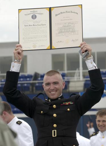 Keywords: US Navy 040528-N-9693M-020 Newly commissioned 2nd Lt. Aaron Tyler displays his degree to family and friends in the crowd during the U.S. Naval Academy class of 2004 graduation and commissioning ceremony.jpg en U S Naval Academy May 28 2004 Newly commissioned 2nd Lt Aaron Tyler displays his degree to family and friends in the crowd during the U S Naval Academy class of 2004 graduation and commissioning ceremony Nine hundred-ninety Midshipmen graduated from the U S Naval Academy and became commissioned officers in the U S Military Chairman of the Joint Chiefs of Staff Gen Richard B Myers delivered the commencement address and personally greeted each graduate during the ceremony The men and women of the graduating class were sworn into the Navy as Ensigns or into the Marine Corps as Second Lieutenants One hundred fifty-eight graduates chose to continue their military careers in the U S Marine Corps U S Navy photo by Photographer's Mate 2nd Class Damon J Moritz RELEASED 2004-05-28 040528-N-9693M-020 Navy http //www navy mil/view_image asp id 14489 U S Navy photo by Photographer's Mate 2nd Class Damon J Moritz PD-USGov-Military-Navy Graduation and Commissioning Ceremony May 28 2004 Taken with Nikon D1X |