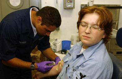 Keywords: US Navy 040601-N-6536T-007 Hospital Corpsman Seaman Jacob Dennis, of Prescott, Ariz., draws blood from Electricians Technician 2nd Class Sharon Shriner, of Beaumont, Texas.jpg en South Atlantic Ocean Jun 1 2004 - Hospital Corpsman Seaman Jacob Dennis of Prescott Ariz draws blood from Electricians Technician 2nd Class Sharon Shriner of Beaumont Texas during a birth month recall aboard USS Ronald Reagan CVN 76 Reagan is underway circumnavigating South America on her way to her new homeport of San Diego Calif U S Navy photo by Photographer's Mate 3rd Class Elizabeth Thompson RELEASED 2004-06-01 040601-N-6536T-007 Navy http //www navy mil/view_image asp id 14670 U S Navy photo by Photographer's Mate 3rd Class Elizabeth Thompson PD-USGov-Military-Navy Medical spaces of USS Ronald Reagan CVN-76 Hospital Corpsman |