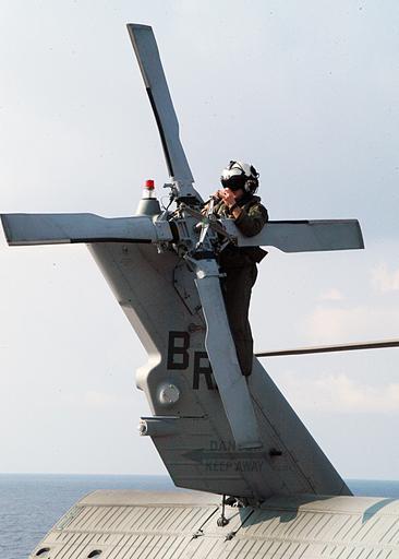 Keywords: US Navy 040608-N-1512S-036 A pilot from USS Detroit (AOE 4) checks the tail rotor on a MH-60S Knighthawk for safe flight while aboard the amphibious assault ship USS Kearsarge (LHD 3).jpg en Atlantic Ocean June 8 2004 A pilot from USS Detroit AOE 4 checks the tail rotor on a MH-60S Knighthawk for safe flight while aboard the amphibious assault ship USS Kearsarge LHD 3 Kearsarge is currently deployed to transport elements of the 24th Marine Expeditionary Unit MEU Air Combat Element to the Central Command Area of Responsibility AOR in support of Operation Iraqi Freedom OIF U S Navy photo by Photographer s Mate Airman Kenny Swartout RELEASED 2004-06-08 040608-N-1512S-036 Navy http //www navy mil/view_image asp id 14855 U S Navy photo by Photographer s Mate Airman Kenny Swartout PD-USGov-Military-Navy Aboard USS Kearsarge LHD-3 |