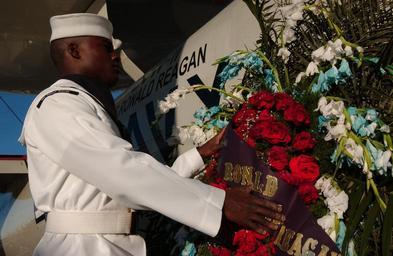 Keywords: US Navy 040611-N-2788L-052 USS Ronald Reagan (CVN 76) Honor Guard member Aviation Ordnanceman Airman William Payne, of Bakersfield, Cal., prepares the wreath for the memorial service of late president Ronald Reagan held on the.jpg en Aboard USS Ronald Reagan CVN 76 June 11 2004 - USS Ronald Reagan CVN 76 Honor Guard member Aviation Ordnanceman Airman William Payne of Bakersfield Cal prepares the wreath for the memorial service of late president Ronald Reagan held on the nuclear aircraft carrier The special memorial was held in conjunction with the funeral services being held in Washington D C Ronald Reagan is in the South Atlantic Ocean circumnavigating South America during its transit to its new homeport of San Diego U S Navy photo by PhotographerÃs Mate Airman Paul H Laverty Jr RELEASED 2004-06-11 040611-N-2788L-052 Navy http //www navy mil/view_image asp id 14880 U S Navy photo by PhotographerÃs Mate Airman Paul H Laverty Jr PD-USGov-Military-Navy Ronald Reagan memorial service on USS Ronald Reagan CVN-76 Aviation Ordnanceman Memorial wreaths |