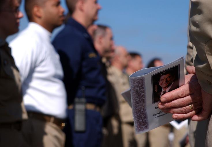 Keywords: US Navy 040615-N-5549O-025 Sailors aboard the aircraft carrier USS Ronald Reagan (CVN 76), attend a remembrance memorial on the flight deck to pay tribute to former President Ronald Reagan.jpg en South Atlantic Ocean Jun 15 2004 - Sailors aboard the aircraft carrier USS Ronald Reagan CVN 76 attend a remembrance memorial on the flight deck to pay tribute to former President Ronald Reagan The ship is in the South Atlantic Ocean circumnavigating South America while transiting to its new homeport in San Diego Calif U S Navy photo by Photographer's Mate Airman Kevin S O'Brien RELEASED 2004-06-15 040615-N-5549O-025 Navy http //www navy mil/view_image asp id 15199 U S Navy photo by Photographer's Mate Airman Kevin S O'Brien PD-USGov-Military-Navy Ronald Reagan memorial service on USS Ronald Reagan CVN-76 |
