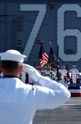 Keywords: US Navy 040615-N-5549O-049 Senior leadership and Sailors aboard the aircraft carrier USS Ronald Reagan (CVN 76), salute the National Ensign during a remembrance memorial to former President Ronald Reagan.jpg en South Atlantic Ocean Jun 15 2004 - Senior leadership and Sailors aboard the aircraft carrier USS Ronald Reagan CVN 76 salute the National Ensign during a remembrance memorial to former President Ronald Reagan The ship is currently in the South Atlantic Ocean circumnavigating South America while transiting to its new homeport in San Diego U S Navy photo by Photographer's Mate Airman Kevin S O'Brien RELEASED 2004-06-15 040615-N-5549O-049 Navy http //www navy mil/view_image asp id 15200 U S Navy photo by Photographer's Mate Airman Kevin S O'Brien PD-USGov-Military-Navy Ronald Reagan memorial service on USS Ronald Reagan CVN-76 76 number Military salutes to flags of the United States |
