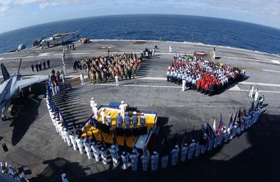 Keywords: US Navy 040615-N-9319H-034 On the flight deck aboard the aircraft carrier USS Ronald Reagan (CVN 76), crew members attend a remembrance memorial for former President Ronald Reagan.jpg en South Atlantic Ocean Jun 14 2004 - On the flight deck aboard the aircraft carrier USS Ronald Reagan CVN 76 crew members attend a remembrance memorial for former President Ronald Reagan The ship is currently in the South Atlantic Ocean circumnavigating South America while transiting to its new homeport of San Diego Calif U S Navy photo by Photographer's Mate 3rd Class Angel G Hilbrands RELEASED 2004-06-14 040615-N-9319H-034 Navy http //www navy mil/view_image asp id 15202 U S Navy photo by Photographer's Mate 3rd Class Angel G Hilbrands PD-USGov-Military-Navy Flight deck of USS Ronald Reagan CVN-76 |