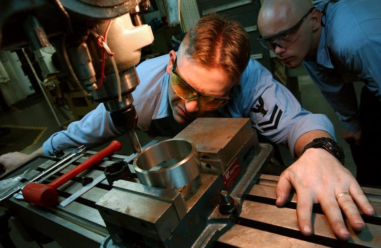 Keywords: US Navy 040618-N-8148A-037 Machinery Repairman 2nd Class Michael Wallace, left, from Jackson, Ohio, ensures a milling machine drill bit shaves a key way precisely at the pre-aligned position on a tension wrench.jpg en South Pacific Ocean June 18 2004 Machinery Repairman 2nd Class Michael Wallace left from Jackson Ohio ensures a milling machine drill bit shaves a key way precisely at the pre-aligned position on a tension wrench while Machinery Repairman 2nd Class Daniel Goda from Phoenix Az observes aboard USS Ronald Reagan CVN 76 Reagan is in the South Atlantic Ocean circumnavigating South America during transit to its new homeport of San Diego Calif U S Navy photo by Photographer s Mate 3rd Class Kitt Amaritnant RELEASED 2004-06-18 040618-N-8148A-037 Navy http //www navy mil/view_image asp id 15372 U S Navy photo by Photographer s Mate 3rd Class Kitt Amaritnant PD-USGov-Military-Navy Aboard USS Ronald Reagan CVN-76 |