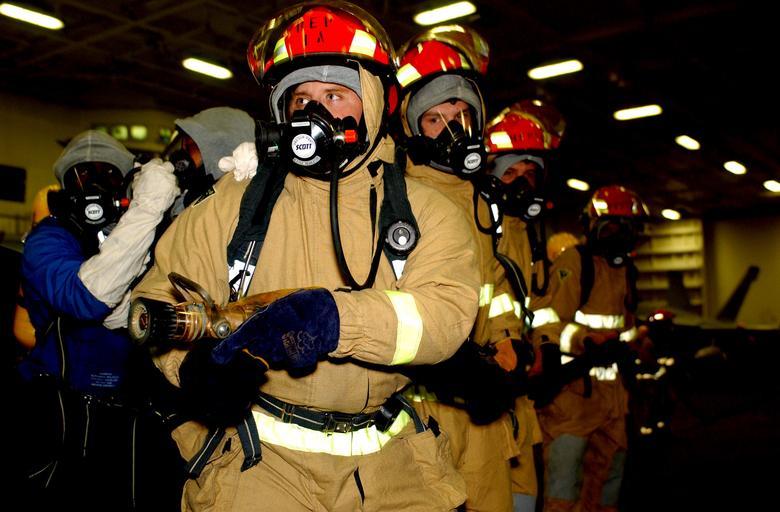Keywords: US Navy 040619-N-4776G-004 Legalman 2nd Class Matthew Mayner, from Charleston, Ark., leads a fire fighting hose team during a General Quarters (GQ) drill aboard the Nimitz-class aircraft carrier USS Ronald Reagan (CVN 76).jpg en South Pacific Ocean June 19 2004 Legalman 2nd Class Matthew Mayner from Charleston Ark leads a fire fighting hose team during a General Quarters GQ drill aboard the Nimitz-class aircraft carrier USS Ronald Reagan CVN 76 Reagan is in the South Atlantic Ocean circumnavigating South America during transit to its new homeport of San Diego Calif U S Navy photo by Photographer's Mate Airman Kathleen Gorby RELEASED 2004-06-19 040619-N-4776G-004 Navy http //www navy mil/view_image asp id 15375 U S Navy photo by Photographer's Mate Airman Kathleen Gorby PD-USGov-Military-Navy Legalman Firefighting training on USS Ronald Reagan CVN-76 |