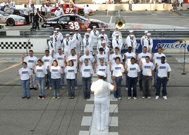 | Keywords: US Navy 040626-N-5576W-003 Vice Commander, Space and Naval Warfare Systems Command, Rear Adm. Michael A. Sharp, administers the oath of enlistment.jpg en Milwaukee Wis June 25 2004 - Vice Commander Space and Naval Warfare Systems Command Rear Adm Michael A Sharp administers the oath of enlistment of 20 new recruit Sailors during the pre-race ceremonies at the Alan Kulwicki 250 Busch Series race More than 60 students and staff assigned to Training Support Command TSC Great Lakes participated in a flag unfurling during pre-race ceremonies at Milwaukee Miles Black Cat Fireworks 200 Craftsman Truck Series race and the Alan Kulwicki 250 Busch Series race on the evenings of June 25th and 26th U S Navy Recruiters were on hand to answer questions about the Navy and one of the No 14 Chevy Monte Carlos was also on hand for fans to admire U S Navy photo by Photographer's Mate 1st Class Michael Worner RELEASED 2004-06-25 040626-N-5576W-003 Navy http //www navy mil/view_image asp id 15530 U S Navy photo by Photographer's Mate 1st Class Michael Worner PD-USGov-Military-Navy Milwaukee Wisconsin Oath of enlistment |