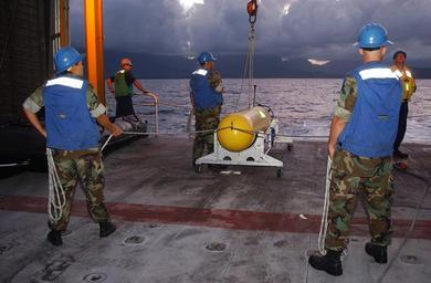 Keywords: US Navy 040708-N-6932B-111 Crewmen assigned to Commander Mine Warfare Command, Unmanned Underwater Vehicle (UUV) Detachment prepare to launch a Battle-Space Preparation Autonomous Underwater Vehicle.jpg en Pacific Ocean July 08 2004 Crewmen assigned to Commander Mine Warfare Command Unmanned Underwater Vehicle UUV Detachment prepare to launch a Battle-Space Preparation Autonomous Underwater Vehicle BPAUV on board High-Speed Vessel Swift HSV 2 during exercise Rim of the Pacific RIMPAC 2004 BPAUV s are small fast underwater robots that maps the ocean bottom near the shore detect changes in inshore conditions and hunt mines RIMPAC is the largest international maritime exercise in the waters around the Hawaiian Islands This year's exercise includes seven participating nations; Australia Canada Chile Japan South Korea the United Kingdom and the United States RIMPAC is intended to enhance the tactical proficiency of participating units in a wide array of combined operations at sea while enhancing stability in the Pacific Rim region U S Navy photo by Photographer's Mate 2nd Class Richard J Brunson RELEASED For more information go to <a href http //www cpf navy mil/RIMPAC2004 Target _BLANK >http //www cpf navy mil/RIMPAC2004</a>/ 2004-07-08 040708-N-6932B-111 Navy http //www navy mil/view_image asp id 16115 U S Navy photo by Photographer's Mate 2nd Class Richard J Brunson PD-USGov-Military-Navy Aboard HSV-2 Swift RIMPAC 2004 Bluefin-21 Change of command |