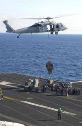| Keywords: US Navy 040806-N-1485H-015 An MH-60 Knight Hawk helicopter assigned to Helicopter Anti-submarine Squadron (HS-14) transfers supplies.jpg en Pacific Ocean Aug 6 2004 - An MH-60 Knight Hawk helicopter assigned to Helicopter Anti-submarine Squadron HS-14 transfers supplies from the Military Sealift Command combat stores ship USNS Concord T-AFS 3 to the flight deck aboard the aircraft carrier USS Kitty Hawk CV 63 during a replenishment-at-sea RAS evolution The Kitty Hawk Carrier Strike Group is one of seven carrier strike groups CSGs involved in Summer Pulse 2004 demonstrating the Navy's ability to provide credible combat power across the globe in five theaters with other U S allied and coalition military forces Summer Pulse is the Navy's first test of its new Fleet Response Plan FRP Kitty Hawk is the world's only permanently forward-deployed aircraft carrier home based in Yokosuka Japan U S Navy photo by Photographer's Mate 3rd Class Lamel J Hinton RELEASED For more information go to <a href http //www cffc navy mil/summerpulse04 htm Target _BLANK >www cffc navy mil/summerpulse04 htm</a> 2004-08-06 040806-N-1485H-015 Navy http //www navy mil/view_image asp id 16881 U S Navy photo by Photographer's Mate 3rd Class Lamel J Hinton PD-USGov-Military-Navy MH-60S helihoisting cargo Helicopter Anti-Submarine Squadron 14 United States Navy Flight deck of USS Kitty Hawk CV-63 |