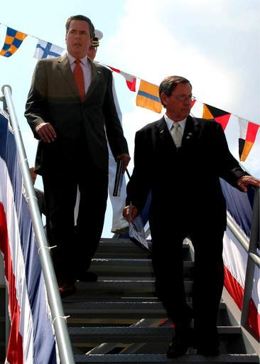 | Keywords: US Navy 040828-N-2354M-003 Florida Governor, Jeb Bush, escorted by Mr. Joe Hanna, from Northrop Grumman, depart the guided missile destroyer USS Momsen (DDG 92).jpg en Panama City Fla Aug 28 2004 - Florida Governor Jeb Bush escorted by Mr Joe Hanna from Northrop Grumman depart the guided missile destroyer USS Momsen DDG 92 after the ship's commissioning ceremony in Panama City Fla Momsen is named after Vice Admiral Charles Swede Momsen VADM Momsen is best known for the development of a submarine escape breathing device known as the Momsen Lung His contributions to the Naval Diving community were honored with the commissioning of the Navy's newest guided missile destroyer bearing his name U S Navy photo by Photographer's Mate 1st Class Dawn C Montgomery RELEASED 2004-08-28 040828-N-2354M-003 Navy http //www navy mil/view_image asp id 17264 U S Navy photo by Photographer's Mate 1st Class Dawn C Montgomery PD-USGov-Military-Navy Commissioning of USS Momsen DDG-92 Jeb Bush |