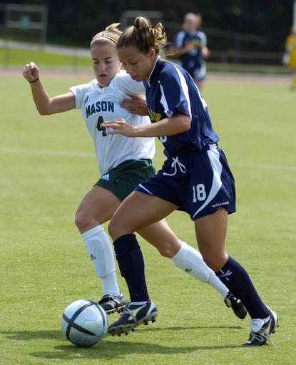 Keywords: US Navy 040829-N-9694M-002 U.S. Naval Academy Midshipman 3rd Class Meggie Curran races to keep the ball away from George Mason University's Danielle McDonald during a regular season soccer match.jpg en Fairfax Va Aug 29 2004 - U S Naval Academy Midshipman 3rd Class Meggie Curran races to keep the ball away from George Mason University's Danielle McDonald during a regular season soccer match Sophomore forward Meggie Curran from Silver Spring Md put the Mids on top in the 14th minute when rookie Kari Weniger St Petersburg Fla crossed the ball to Curran who fired in the shot to the lower left side of the net Two days after playing the eighth-ranked team in the country Connecticut the Navy women's soccer team 0-1-1 battled George Mason 1-0-1 to a 1-1 tie at George Mason Stadium in Fairfax Va U S Navy photo by Damon J Moritz RELEASED 2004-08-29 040829-N-9694M-002 Navy http //www navy mil/view_image asp id 17297 U S Navy photo by Damon J Moritz PD-USGov-Military-Navy Images from US Navy location FAIRFAX Va Association football in the United States George Mason University United States Naval Academy athletics Photos taken with Nikon D2H |