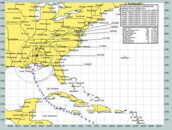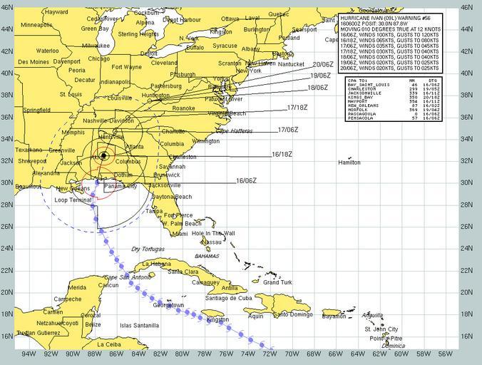 Keywords: US Navy 040916-N-0000X-001 Current forecast projected path and wind speeds of Hurricane Ivan from Sept 16 to Sept 20.jpg en Gulf of Mexico Sept 16 2004 - Current forecast projected path and wind speeds of Hurricane Ivan from Sept 16 to Sept 20 Ivan a category one hurricane on the Saffir-Simpson Hurricane scale has maximum sustained winds near 80 mph with higher gusts Hurricane force winds extend outward up to 150 miles from the center and tropical storm force winds extend outward up to 290 miles The eye of hurricane Ivan was located about 90 miles west-southwest Montgomery Ala Ivan made landfall at Gulf Shores Ala at approximately 0315 EST Hurricane Ivan has killed at least 80 people since it's development in the Caribbean Sea Photo provided by Naval Atlantic Meteorology and Oceanography Center RELEASED For more information visit <a href https //weather navy mil Target _BLANK >https //weather navy mil</a> 2004-09-16 040916-N-0000X-001 Navy http //www navy mil/view_image asp id 17680 U S Navy photo PD-USGov-Military-Navy Maps of the Gulf of Mexico |