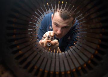 Keywords: US Navy 040920-N-7568S-004 Electricians Mate 3rd Class Brent Gallagher of Knoxville, Tenn., ties down lamination for varnishing on the number 4 Main Machinery Room exhaust ventilation stator.jpg en Arabian Gulf Sept 20 2004 - Electricians Mate 3rd Class Brent Gallagher of Knoxville Tenn ties down lamination for varnishing on the number 4 Main Machinery Room exhaust ventilation stator in the motor rewind shop aboard the conventionally powered aircraft carrier USS John F Kennedy CV 67 The motor rewind shop conducts routine maintenance to improve the productivity and life of various motor components Kennedy and embarked Carrier Air Wing Seventeen CVW-17 are currently deployed in support of Operation Iraqi Freedom OIF U S Navy photo by Photographer's Mate Airman Grantez Stephens RELEASED 2004-09-20 040920-N-7568S-004 Navy http //www navy mil/view_image asp id 17766 U S Navy photo by Photographer's Mate Airman Grantez Stephens PD-USGov-Military-Navy Aboard USS John F Kennedy CV-67 |