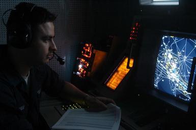 Keywords: US Navy 040929-N-1205W-002 Operations Specialist Seaman Jerry Portillo monitors the Auto Tracking Management console, which detects and track surface contacts in the Combat Direction Center (CDC) aboard the conventionally power.jpg en Arabian Gulf Sept 29 2004 - Operations Specialist Seaman Jerry Portillo monitors the Auto Tracking Management console which detects and track surface contacts in the Combat Direction Center CDC aboard the conventionally powered aircraft carrier USS John F Kennedy CV 67 CDC personnel gather information on the tactical situation and present it to the Tactical Action Officer TAO for evaluation Kennedy and embarked Carrier Air Wing Seventeen CVW-17 are currently on deployment in the 5th Fleet area of responsibility AOR in support of Operation Iraqi Freedom OIF U S Navy photo by Photographer s Mate 2nd Class Regina Wiss RELEASED 2004-09-29 040929-N-1205W-002 Navy http //www navy mil/view_image asp id 17977 U S Navy photo by Photographer s Mate 2nd Class Regina Wiss PD-USGov-Military-Navy Aboard USS John F Kennedy CV-67 Operations Specialist United States Navy |