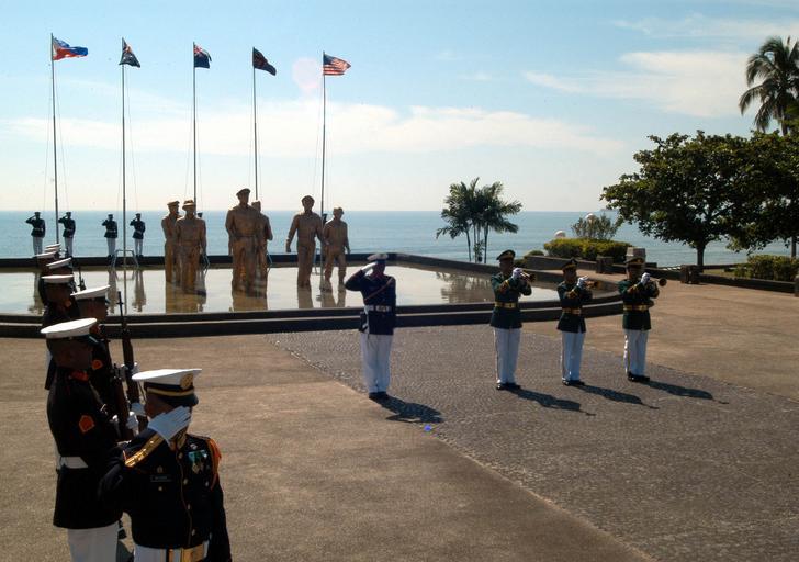 | Keywords: US Navy 041020-N-0493B-003 Backed by a monument marking the location of Gen. Douglas MacArthur's return to the Philippines 60 years ago, a Philippine Marine Corps honor guard stands at attention during the playing of Taps.jpg en Tacloban Philippines Oct 20 2004 - Backed by a monument marking the location of Gen Douglas MacArthur's return to the Philippines 60 years ago a Philippine Marine Corps honor guard stands at attention during the playing of Taps in honor of those who lost their lives during the Battle of Leyte Gulf Philippine President Gloria Macapagal-Arroyo U S Ambassador to the Philippines Francis Ricciardone and others spoke of the sacrifices made by veterans and the closeness of the U S -Philippines relationship still today Retired Adm Ronald Hays a former commander of U S Pacific Command along with Commander of Logistics Group Western Pacific Rear Adm Kevin Quinn represented the U S Navy during the ceremony U S Navy photo by Lt Chuck Bell RELEASED 2004-10-20 041020-N-0493B-003 Navy http //www navy mil/view_image asp id 18322 U S Navy photo by Lt Chuck Bell PD-USGov-Military-Navy Leyte Landing Memorial Kevin M Quinn |