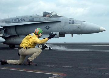 | Keywords: US Navy 041209-N-6363M-005 Lt. cmdr. Brian Weiss launches an F-A-18A- Hornet assigned to the Silver Eagles of Marine Fighter Attack Squadron One One Five (VMFA-115).jpg en Persian Gulf Dec 9 2004 Lt cmdr Brian Weiss launches an F/A-18A+ Hornet assigned to the Silver Eagles of Marine Fighter Attack Squadron One One Five VMFA-115 from one of the four steam-powered catapults aboard the Nimitz-class aircraft carrier USS Harry S Truman CVN 75 Currently aircraft from Carrier Air Wing Three CVW-3 embarked aboard Truman are providing close air support and conducting intelligence surveillance and reconnaissance missions in ongoing operations over Iraq Truman s Carrier Strike Group Ten CSG-10 and CVW-3 are on a regularly scheduled deployment in support of the Global War on Terrorism US Navy photo by Photographer s Mate Airman Philip V Morrill RELEASED 2004-12-09 041209-N-6363M-005 Navy http //www navy mil/view_image asp id 19666 U S Navy photo PD-USGov-Military-Navy Aboard USS Harry S Truman CVN-75 |
