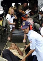Keywords: US Navy 050103-N-4166B-179 Sailors, assigned to Carrier Air Wing Two (CVW-2) and aid workers unload injured Indonesians from the cabin of an MH-60S Knighthawk helicopter.jpg en Aceh Sumatra Indonesia Jan 3 2005 - Sailors assigned to Carrier Air Wing Two CVW-2 and aid workers unload injured Indonesians from the cabin of an MH-60S Knighthawk helicopter assigned to the Gunbearers of Helicopter Combat Support Squadron Eleven HC-11 Detachment Two to a triage site for treatment and evaluation Medical teams from USS Abraham Lincoln CVN 72 Carrier Air Wing Two CVW-2 and the International Organization for Migration IOM set-up a triage site located on Sultan Iskandar Muda Air Force Base in Banda Aceh Sumatra The two teams worked together with members of the Australian Air Force to provide initial medical care to victims of the Tsunami-stricken coastal regions The Abraham Lincoln Carrier Strike Group is currently operating in the Indian Ocean off the waters of Indonesia and Thailand U S Navy photo by Photographer's Mate Airman Jordon R Beesley RELEASED 2005-01-03 050103-N-4166B-179 Navy http //www navy mil/view_image asp id 20097 U S Navy photo by Photographer's Mate Airman Jordon R Beesley PD-USGov-Military-Navy Aceh Humanitarian aid in Indonesia Helicopter Combat Support Squadron 11 United States Navy |