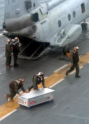 | Keywords: US Navy 050105-N-9214D-072 Marines unload medical supplies from a CH-46 Sea Knight helicopter during vertical replenishment operations aboard the amphibious assault ship USS Bonhomme Richard (LHD 6).jpg en Strait Of Malacca Jan 5 2005 - Marines unload medical supplies from a CH-46 Sea Knight helicopter assigned to the White Knights of Marine Medium Helicopter Squadron One Six Five HMM-165 during vertical replenishment operations aboard the amphibious assault ship USS Bonhomme Richard LHD 6 Bonhomme Richard promptly changed her deployment schedule to support Operation Unified Assistance the humanitarian relief effort in the wake of the Tsunami that struck South East Asia U S Navy photo by Photographer's Mate 2nd Class Juan E Diaz RELEASED 2005-01-05 050105-N-9214D-072 Navy http //www navy mil/view_image asp id 20218 U S Navy photo by Photographer's Mate 2nd Class Juan E Diaz PD-USGov-Military-Navy Images from US Navy location Strait of Malacca CH-46 US Marine Corps Aboard USS Bonhomme Richard LHD-6 |
