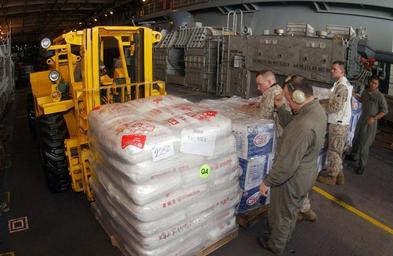 Keywords: US Navy 050110-N-3970R-016 U.S. Marines load relief supplies aboard a Landing Craft Air Cushion (LCAC) in the well deck.jpg en Indian Ocean Jan 10 2005 - U S Marines load relief supplies aboard a Landing Craft Air Cushion LCAC in the well deck aboard the amphibious assault ship USS Bonhomme Richard LHD 6 LCAC's assigned to Assault Craft Unit Five ACU-5 assigned to Bonhomme Richard delivered 34 000 pounds of aid to the Tsunami stricken city of Meulaboh on the island of Sumatra Indonesia The Bonhomme Richard Expeditionary Strike Group is currently operating in the Indian Ocean off the waters of Indonesia and Thailand in support of Operation Unified Assistance the humanitarian operation effort in the wake of the Tsunami that struck South East Asia U S Navy photo by Photographer's Mate 3rd Class Jennifer Rivera RELEASED 2005-01-10 050110-N-3970R-016 Navy http //www navy mil/view_image asp id 20469 U S Navy photo by Photographer's Mate 3rd Class Jennifer Rivera PD-USGov-Military-Navy Landing Craft Air Cushion Aboard USS Bonhomme Richard LHD-6 Military forklifts Well decks