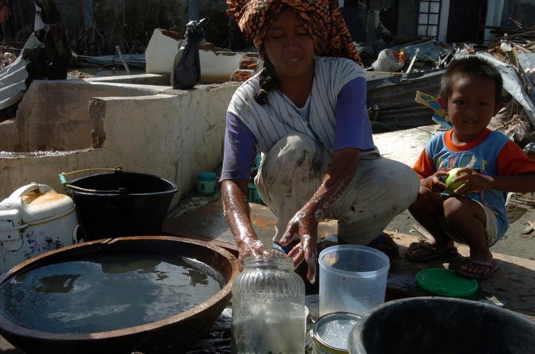 | Keywords: US Navy 050113-N-7586B-266 An Indonesian woman and child wash dishes amid rubble in the city of Meulaboh on the island of Sumatra, Indonesia.jpg en Meulaboh Sumatra Indonesia Jan 13 2005 - An Indonesian woman and child wash dishes amid rubble in the city of Meulaboh on the island of Sumatra Indonesia More than 18 000 Marines Sailors Airmen Soldiers and Coast Guardsmen with Combined Support Force 536 CSF-536 are working with international military and commercial organizations to aid the affected people of Thailand Sri Lanka and Indonesia after a magnitude 9 0 earthquake triggered devastating tsunamis International efforts to minimize suffering and mitigate loss of life resulting from the effects of the earthquake and tsunami continue as the Combined Support Force of host nations civilian aid organizations and U S Department of Defense work hand in hand to provide humanitarian assistance in support Operation Unified Assistance U S Navy photo by Photographer's Mate 1st Class Bart A Bauer RELEASED 2005-01-13 050113-N-7586B-266 Navy http //www navy mil/view_image asp id 20661 U S Navy photo by Photographer's Mate 1st Class Bart A Bauer PD-USGov-Military-Navy Images from US Navy location Meulaboh Sumatra Indonesia |