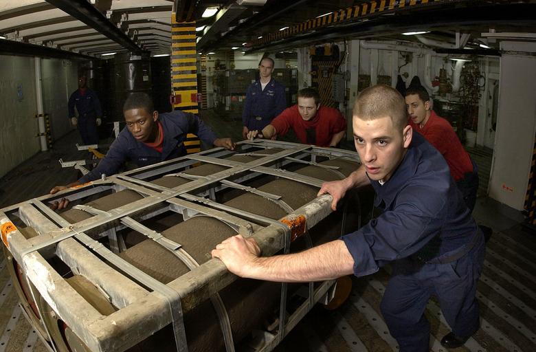 | Keywords: US Navy 050119-N-5464G-011 Sailors assigned to the Weapons Department aboard USS Kitty Hawk (CV 63), move a palette of MK-84 2000 pound general purpose bombs into a magazine.jpg en Pacific Ocean Jan 19 2005 Sailors assigned to the Weapons Department aboard USS Kitty Hawk CV 63 move a palette of MK-84 2000 pound general purpose bombs into a magazine The Mk-84 is a multi-purpose bomb designed to provide blast and fragmentation effects and can be configured with several different guidance systems to customize the weapon to the mission requirements Currently under way in the 7th Fleet area of responsibility AOR Kitty Hawk demonstrates power projection and sea control as the U S Navy's only permanently forward-deployed aircraft carrier operating from Yokosuka Japan U S Navy photo by Photographer's Mate Airman Theron J Godbold RELEASED 2005-01-19 050119-N-5464G-011 Navy http //www navy mil/view_image asp id 20897 U S Navy photo by Photographer's Mate Airman Theron J Godbold PD-USGov-Military-Navy Mark 84 bomb Aboard USS Kitty Hawk CV-63 |