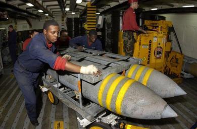 | Keywords: US Navy 050119-N-5464G-030 Sailors assigned to the Weapons Department aboard USS Kitty Hawk (CV 63), move a palette of BLU-109 2000 pound general purpose bombs into a magazine.jpg en Pacific Ocean Jan 19 2005 - Sailors assigned to the Weapons Department aboard USS Kitty Hawk CV 63 move a palette of BLU-109 2000 pound general purpose bombs into a magazine The Mk-84 is a multi-purpose bomb designed to provide blast and fragmentation effects and can be configured with several different guidance systems to customize the weapon to mission requirements Currently under way in the 7th Fleet area of responsibility AOR Kitty Hawk demonstrates power projection and sea control as the U S Navy's only permanently forward-deployed aircraft carrier operating from Yokosuka Japan U S Navy photo by Photographer's Mate Airman Theron J Godbold RELEASED 2005-01-19 050119-N-5464G-030 Navy http //www navy mil/view_image asp id 20998 U S Navy photo by Photographer's Mate Airman Theron J Godbold PD-USGov-Military-Navy Aboard USS Kitty Hawk CV-63 Mark 84 bomb |