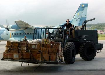 Keywords: US Navy 050123-N-8801B-167 U.S. Air Force Staff Sgt. Austin Bretwell, assigned to the 615th Air Mobility Operations Group, drives a five ton forklift as he transports food, clothing and relief supplies from a warehouse to await.jpg en Banda Aceh Sumatra Indonesia Jan 23 2005 - U S Air Force Staff Sgt Austin Bretwell assigned to the 615th Air Mobility Operations Group drives a five ton forklift as he transports food clothing and relief supplies from a warehouse to awaiting U S Navy helicopters at Sultan Iskandar Muda Air Force Base in Banda Aceh Sumatra Indonesia Essex is currently underway in support of Operation Unified Assistance the humanitarian operation effort in the wake of the Tsunami that struck South East Asia Essex is the Navy's only forward deployed amphibious assault ship homeported in Sasebo Japan U S Navy photo by Photographer's Mate 3rd Class Travis M Burns RELEASED 2005-01-23 050123-N-8801B-167 Navy http //www navy mil/view_image asp id 21102 U S Navy photo by Photographer's Mate 3rd Class Travis M Burns PD-USGov-Military-Navy Sultan Iskandar Muda International Airport 615th Contingency Response Wing United States Air Force |