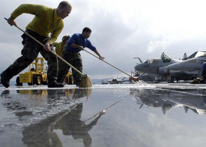 | Keywords: US Navy 050203-N-1229B-051 Sailors assigned to the Air Department aboard the aircraft carrier USS Abraham Lincoln (CVN 72) remove water from the flight deck after washing the ships^rsquo, island.jpg en Indian Ocean Feb 2 2005 - Sailors assigned to the Air Department aboard the aircraft carrier USS Abraham Lincoln CVN 72 remove water from the flight deck after washing the ships island The Abraham Lincoln Carrier Strike Group is operating in the Indian Ocean off the waters of Indonesia in support of Operation Unified Assistance the humanitarian relief effort to aid the victims of the tsunami that struck Southeast Asia U S Navy photo by Photographer s Mate Airman Patrick M Bonafede RELEASED 2005-02-02 050203-N-1229B-051 Navy http //www navy mil/view_image asp id 21514 U S Navy photo by Photographer s Mate Airman Patrick M Bonafede PD-USGov-Military-Navy Aboard USS Abraham Lincoln CVN-72 Sweeping Water reflections in the United States Water reflections of people |
