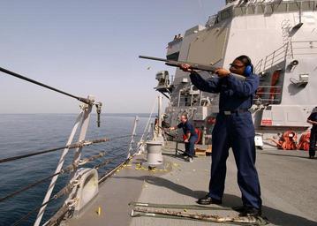 | Keywords: US Navy 050206-N-5345W-027 A Sailor fires a .12-gauge shotgun while shooting skeet from the forecastle during a holiday routine aboard the Arleigh Burke-class guided missile destroyer USS Mason (DDG 87).jpg en Persian Gulf Feb 6 2005 A Sailor fires a 12-gauge shotgun while shooting skeet from the forecastle during a holiday routine aboard the Arleigh Burke-class guided missile destroyer USS Mason DDG 87 Mason is conducting operations in the Persian Gulf as a part of Destroyer Squadron Two Six DESRON 26 and the USS Harry S Truman CVN 75 Carrier Strike Group CSG The Truman CSG and CVW-3 are on a regularly scheduled deployment in support of the Global War on Terrorism U S Navy photo by Photographer's Mate Airman Kristopher Wilson RELEASED 2005-02-06 050206-N-5345W-027 Navy http //www navy mil/view_image asp id 21816 U S Navy photo by Photographer's Mate Airman Kristopher Wilson PD-USGov-Military-Navy USS Mason DDG-87 Clay pigeon shooting Clay pigeon weapons |