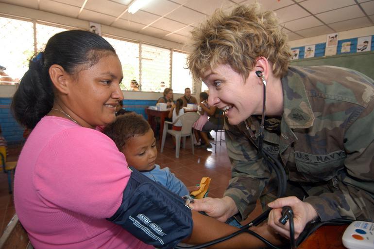 Keywords: US Navy 050310-N-1159B-114 Lt. Cmdr. Lisa Kromanaker, a nurse assigned to Operational Health Support Unit Great Lakes, Ill., measures the blood pressure of a Nicaraguan woman during a Medical Readiness Training Exercise.jpg en Palo Grande Chinandega Nicaragua Mar 10 2005 - Lt Cmdr Lisa Kromanaker a nurse assigned to Operational Health Support Unit Great Lakes Ill measures the blood pressure of a Nicaraguan woman during a Medical Readiness Training Exercise Over 10 days a Navy Operational Health Support Unit will treat up to 5 000 people at three different sites throughout rural Chinandega during Exercise New Horizons 2005 Exercise New Horizons is a joint-combined service engineering and humanitarian aid mission and will begin groundbreaking on the construction of four schools and two medical clinics in Nicaragua U S Navy photo by Journalist 2nd Class Brian Brannon RELEASED 2005-03-10 050310-N-1159B-114 Navy http //www navy mil/view_image asp id 22730 U S Navy photo by Journalist 2nd Class Brian Brannon PD-USGov-Military-Navy Images from US Navy location Palo Grande Chinandega Nicaragua |