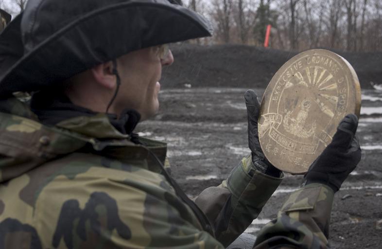 | Keywords: US Navy 050311-N-9851B-013 Explosive Ordnance Disposal Mobile Unit 5 (EOD MU5) team member, Chief Boatswain^rsquo,s Mate Brian Haug, inspects the first brass plaque of two created during a day of demolition qualifications at Cam.jpg  en Yokosuka Japan Mar 11 2005 - Explosive Ordnance Disposal Mobile Unit 5 EOD MU5 team member Chief Boatswain s Mate Brian Haug inspects the first brass plaque of two created during a day of demolition qualifications at Camp Fuji The plaque was etched by the force of an explosion precisely directed onto a brass plate in the design of EOD MU5's Japan Detachment logo an example of precisely directed explosive charges U S Navy photo by Photographer's Mate 2nd Class John L Beeman RELEASED 2005-03-11 050311-N-9851B-013 Navy http //www navy mil/view_image asp id 22697 U S Navy photo by Photographer's Mate 2nd Class John L Beeman PD-USGov-Military-Navy Camp Fuji United States Navy Explosive Ordnance Disposal |