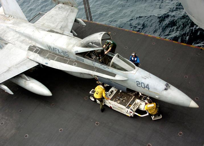 | Keywords: US Navy 050311-N-0535P-193 Air Department personnel prepare to move an F-A-18A- Hornet assigned to the.jpg en Persian Gulf Mar 11 2005 - Air Department personnel prepare to move an F/A-18A+ Hornet assigned to the Silver Eagles of Marine Fighter Attack Squadron One One Five VMFA-115 from one of three aircraft elevators into the ship s hangar bay aboard USS Harry S Truman CVN 75 Carrier Air Wing Three CVW-3 is embarked aboard Truman and is providing close air support and conducting intelligence surveillance and reconnaissance over Iraq The Truman Carrier Strike Group is on a regularly scheduled deployment in support of the Global War on Terrorism U S Navy photo by Photographer's Mate Airman Jay Pugh RELEASED 2005-03-11 050311-N-0535P-193 Navy http //www navy mil/view_image asp id 22787 U S Navy photo by Photographer's Mate Airman Jay Pugh PD-USGov-Military-Navy Aboard USS Harry S Truman CVN-75 |