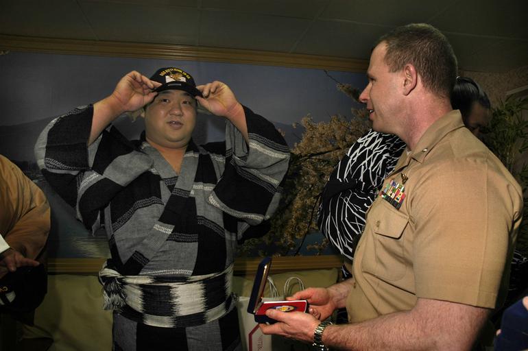Keywords: US Navy 050416-N-9458H-103 Combat Directions Officer, USS Kitty Hawk (CV 63), Cmdr. Luther Hook III, presents a Japanese champion sumo wrestler with a command ball cap and coin during a tour aboard the conventionally powered ai.jpg en Yokosuka Japan Apr 16 2005 - Combat Directions Officer USS Kitty Hawk CV 63 Cmdr Luther Hook III presents a Japanese champion sumo wrestler with a command ball cap and coin during a tour aboard the conventionally powered aircraft carrier Sumo wrestling is the traditional national sport of Japan and grand champions are known as Yokozuna Currently in port Kitty Hawk demonstrates power projection and sea control as the U S Navy's only permanently forward-deployed aircraft carrier operating from Yokosuka Japan U S Navy photo by Photographer's Mate 3rd Class Patrick Hutchison RELEASED 2005-04-16 050416-N-9458H-103 Navy http //www navy mil/view_image asp id 23692 U S Navy photo by Photographer's Mate 3rd Class Patrick Hutchison PD-USGov-Military-Navy United States Fleet Activities Yokosuka Aboard USS Kitty Hawk CV-63 Chiyotaikai Ryƫji Challenge coins |