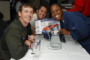Keywords: US Navy 050518-N-6484E-001 Aviation Machinist's Mate Airman Jennifer Singleton poses for a photograph with NASCAR Busch Series Drivers.jpg en Atlantic Ocean May 18 2005 - Aviation Machinist's Mate Airman Jennifer Singleton poses for a photograph with NASCAR Busch Series Drivers Ashton Lewis left of the U S Marines No 25 Ford and David Stremme center of the U S Navy No 14 Dodge during an autograph session aboard the Nimitz-class aircraft carrier USS Theodore Roosevelt CVN 71 The Roosevelt is currently at sea conducting routine carrier operations U S Navy photo by Photographer's Mate Airman Stephen Early RELEASED 2005-05-18 050518-N-6484E-001 Navy http //www navy mil/view_image asp id 24480 U S Navy photo by Photographer's Mate Airman Stephen Early PD-USGov-Military-Navy Ashton Lewis Jr David Stremme Aviation Machinist's Mate Aboard USS Theodore Roosevelt CVN-71 |