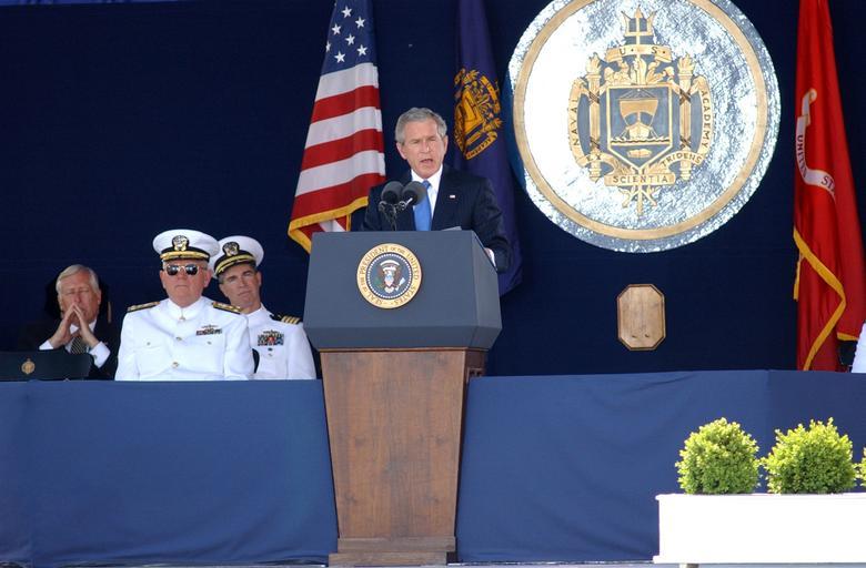 Keywords: US Navy 050527-F-7379W-192 President George W. Bush delivers his remarks as part of the U.S. Naval Academy class of 2005 Graduation and Commissioning Ceremony.jpg en Annapolis Md May 27 2005 - President George W Bush delivers his remarks as part of the U S Naval Academy class of 2005 Graduation and Commissioning Ceremony Nine hundred seventy-six Midshipmen graduated from the U S Naval Academy and became commissioned officers in the U S Military President Bush delivered the commencement address and personally greeted each graduate during the ceremony The men and women of the graduating class were sworn into the Navy as Ensigns or into the Marine Corps as Second Lieutenants U S Air Force photo by Staff Sgt Charles Walker RELEASED 2005-05-27 050527-F-7379W-192 Navy http //www navy mil/view_image asp id 24808 U S Navy photo PD-USGov-Military-Navy Graduation and Commissioning Ceremony May 27 2005 |