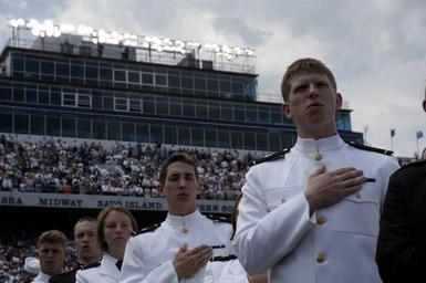 Keywords: US Navy 050527-N-0295M-007 Newly commissioned Ensigns and Second Lieutenants sing the U.S. Naval Academy alma mater Navy Blue And Gold.jpg en Annapolis Md May 27 2005 Newly commissioned Ensigns and Second Lieutenants sing the U S Naval Academy alma mater Navy Blue And Gold as part of the 2005 Graduation and Commissioning Ceremony at the U S Naval Academy Nine hundred seventy-six Midshipmen graduated from the U S Naval Academy and became commissioned officers in the U S Military President George W Bush delivered the commencement address and personally greeted each graduate during the ceremony The men and women of the graduating class were sworn into the Navy as Ensigns or into the Marine Corps as Second Lieutenants U S Navy photo by Photographer s Mate 2nd Class Daniel J McLain RELEASED 2005-05-27 050527-N-0295M-007 Navy http //www navy mil/view_image asp id 24783 U S Navy photo by Photographer s Mate 2nd Class Daniel J McLain PD-USGov-Military-Navy Graduation and Commissioning Ceremony May 27 2005 |