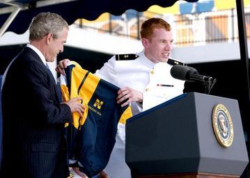 Keywords: US Navy 050527-N-5390M-193 A graduating Midshipman presents U.S. President George W. Bush with a Naval Academy windbreaker jacket, during the 2005 Naval Academy Graduation Ceremony.jpg en Annapolis Md May 27 2005 A graduating Midshipman presents U S President George W Bush with a Naval Academy windbreaker jacket during the 2005 Naval Academy Graduation Ceremony at the Navy Marine Corps Memorial Stadium President George W Bush delivered the commencement address and personally greeted each graduate during the ceremony The men and women of the graduating class were sworn into the Navy as ensigns or into the Marine Corps as 2nd lieutenants U S Navy photo by Ken Mierzejewski RELEASED 2005-05-27 050527-N-5390M-193 Navy http //www navy mil/view_image asp id 24990 U S Navy photo by Ken Mierzejewski PD-USGov-Military-Navy George W Bush in 2005 Jackets Graduation and Commissioning Ceremony May 27 2005 |