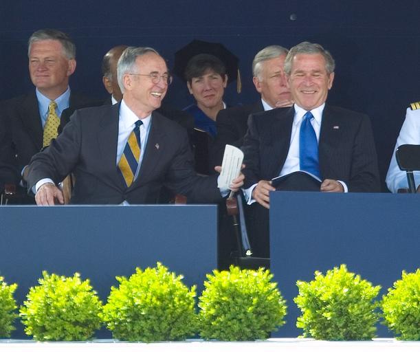 Keywords: US Navy 050527-N-9693M-012 President George W. Bush and Secretary of the Navy Gordon England share a humorous moment during the U.S. Naval Academy class of 2005 Graduation and Commissioning Ceremony.jpg en Annapolis Md May 27 2005 - President George W Bush and Secretary of the Navy Gordon England share a humorous moment during the U S Naval Academy class of 2005 Graduation and Commissioning Ceremony Nine hundred seventy-six Midshipmen graduated from the U S Naval Academy and became commissioned officers in the U S Military President George W Bush delivered the commencement address and personally greeted each graduate during the ceremony The men and women of the graduating class were sworn into the Navy as Ensigns or into the Marine Corps as Second Lieutenants U S Navy photo by Damon J Moritz RELEASED 2005-05-27 050527-N-9693M-012 Navy http //www navy mil/view_image asp id 24773 U S Navy photo by Damon J Moritz PD-USGov-Military-Navy Gordon R England Graduation and Commissioning Ceremony May 27 2005 |