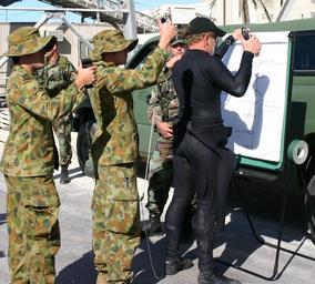 Keywords: US Navy 050618-N-6551H-031 Members of Australian Defense Force Clearance Diver Team Four demonstrate how divers are to line up.jpg en Queensland Australia June 18 2005 - Members of Australian Defense Force Clearance Diver Team Four demonstrate how divers made up from members of U S Navy Mobile Diving Salvage Unit Five MDSU-5 and U S Army Seventh Engineer Detachment Dive are to line up on a pillar before they submerge themselves to search for underwater explosives during exercise Talisman Saber 2005 This is the first time divers from all three services combined to form a joint force team Talisman Sabre is an exercise jointly sponsored by the U S Pacific Command and Australian Defense Force Joint Operations Command and designed to train the U S Seventh Fleet commander's staff and Australian Joint Operations staff as a designated Combined Task Force CTF headquarters The exercise focuses on crisis action planning and execution of contingency response operations U S Pacific Command units and Australian forces will conduct land sea and air training throughout the training area More than 11 000 U S and 6 000 Australian personnel will participate U S Navy photo by Photographer's Mate 1st Class Michelle R Hammond RELEASED 2005-06-18 050618-N-6551H-031 Navy http //www navy mil/view_image asp id 25443 U S Navy photo by Photographer's Mate 1st Class Michelle R Hammond PD-USGov-Military-Navy Clearance Diving Team RAN Images from US Navy location Queensland Australia Talisman Sabre 2005 |