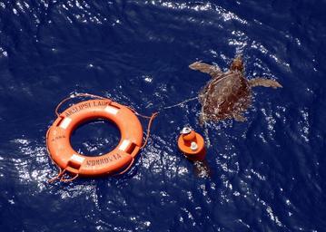 | Keywords: US Navy 050626-N-6616W-003 A sea turtle tangled in a life ring was rescued by crewmembers stationed aboard the amphibious transport ship USS Nashville (LPD 13).jpg en Mediterranean Sea June 24 2005 - A sea turtle tangled in a life ring was rescued by crewmembers stationed aboard the amphibious transport ship USS Nashville LPD 13 Nashville is currently participating in Barbary Thunder II an exercise focused on developing the individual and collective maritime proficiencies of the participating nations Morocco Tunisia France Italy and Spain Barbary Thunder is also to designed to promote friendship mutual understanding and cooperation with regional allies U S Navy photo by Photographer's Mate 2nd Class Steven J Weber RELEASED 2005-06-24 050626-N-6616W-003 Navy http //www navy mil/view_image asp id 25785 U S Navy photo by Photographer's Mate 2nd Class Steven J Weber PD-USGov-Military-Navy Aboard USS Nashville LPD-13 Lifebelts Analipsi Lady ship 2005 Unidentified Chelonioidea |