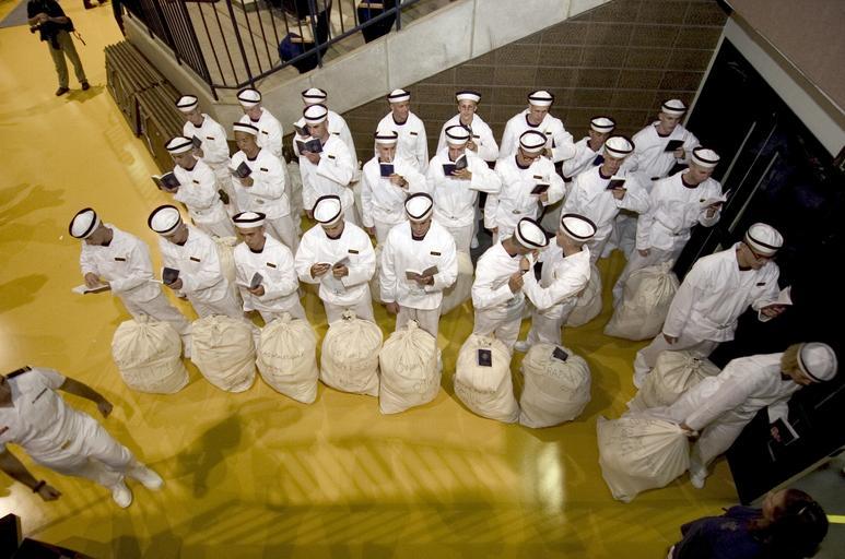 | Keywords: US Navy 050629-N-9693M-767 First day Midshipmen stand at attention while reading Reef Points, the manual for Midshipmen at the United States Naval Academy in Annapolis, Md.jpg en Annapolis Md June 29 2005 - First day Midshipmen stand at attention while reading Reef Points the manual for Midshipmen at the United States Naval Academy in Annapolis Md Approximately 1200 prospective Midshipmen 4th Class Plebes reported to the Academy for Induction into the class of 2009 and the first day of Plebe summer The Plebes were cycled through a series of stations to establish medical and dental records receive uniforms complete paperwork and receive their military haircut U S Navy photo by Mr Damon J Moritz RELEASED 2005-06-29 050629-N-9693M-767 Navy http //www navy mil/view_image asp id 25759 U S Navy photo by Mr Damon J Moritz PD-USGov-Military-Navy United States Naval Academy Induction Day |