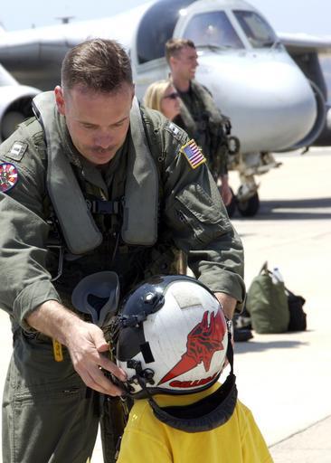 | Keywords: US Navy 050730-N-7286M-041 Lt. Don Rogers reunites with his son and places his flight helmet on his head on the flight line of Naval Air Station North Island.jpg en San Diego Calif July 30 2005 Lt Don Rogers reunites with his son and places his flight helmet on his head on the flight line of Naval Air Station North Island Sea Control Squadron Three Three VS-33 returned home after completing their final deployment VS-33 was embarked aboard the Nimitz-class aircraft carrier USS Carl Vinson CVN 70 in support of the global war on terrorism VS-33 is the last of the West Coast VS squadrons and they are scheduled to be decommissioned in July 2006 U S Navy Photo by Photographer s Mate 2nd Class Daniel R Mennuto RELEASED 2005-07-30 050730-N-7286M-041 Navy http //www navy mil/view_image asp id 26759 U S Navy Photo by Photographer s Mate 2nd Class Daniel R Mennuto PD-USGov-Military-Navy Aboard USS Carl Vinson CVN-70 Naval Air Station North Island in the 2000s |