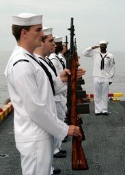 Keywords: US Navy 050730-N-3666S-094 The honor guard aboard the amphibious assault ship USS Wasp (LHD 1) pays respect to a past shipmate during one of three burial at sea ceremonies held aboard the ship.jpg en Atlantic Ocean July 30 2005 - The honor guard aboard the amphibious assault ship USS Wasp LHD 1 pays respect to a past shipmate during one of three burial at sea ceremonies held aboard the ship The families of the deceased received a folded American flag three casings from bullets used during the 21-gun salute a video of the ceremony and a chart locating exactly where their family member's were laid to rest U S Navy photo by Photographer's Mate Airman Robbie Stirrup RELEASED 2005-07-30 050730-N-3666S-094 Navy http //www navy mil/view_image asp id 26822 U S Navy photo by Photographer's Mate Airman Robbie Stirrup PD-USGov-Military-Navy M14 rifle at sea burials USS Wasp LHD-1 flight deck |